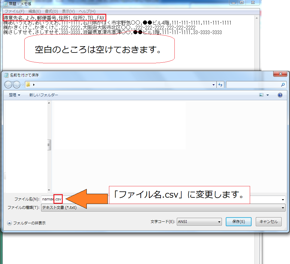 得意先名からFAXまでの情報をカンマ区切りで下に書きます。住所などにデータがなければ何も入力しません。