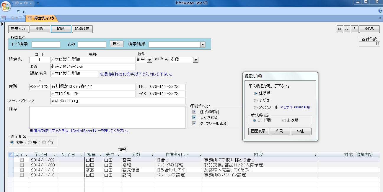 またInfoManager Light V2で登録した用件を得意先ごとに一覧表示します。