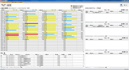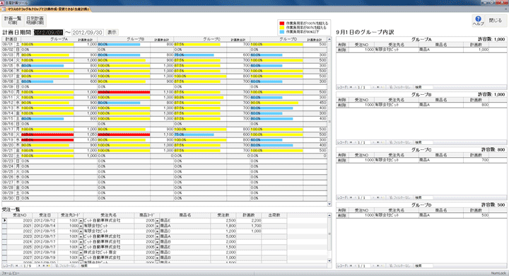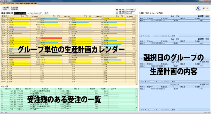 - ツール画面は、「グループ単位の生産計画カレンダー」「受注残のある受注の一覧」「選択日のグループの生産計画の内容」の3つの情報で構成されています。