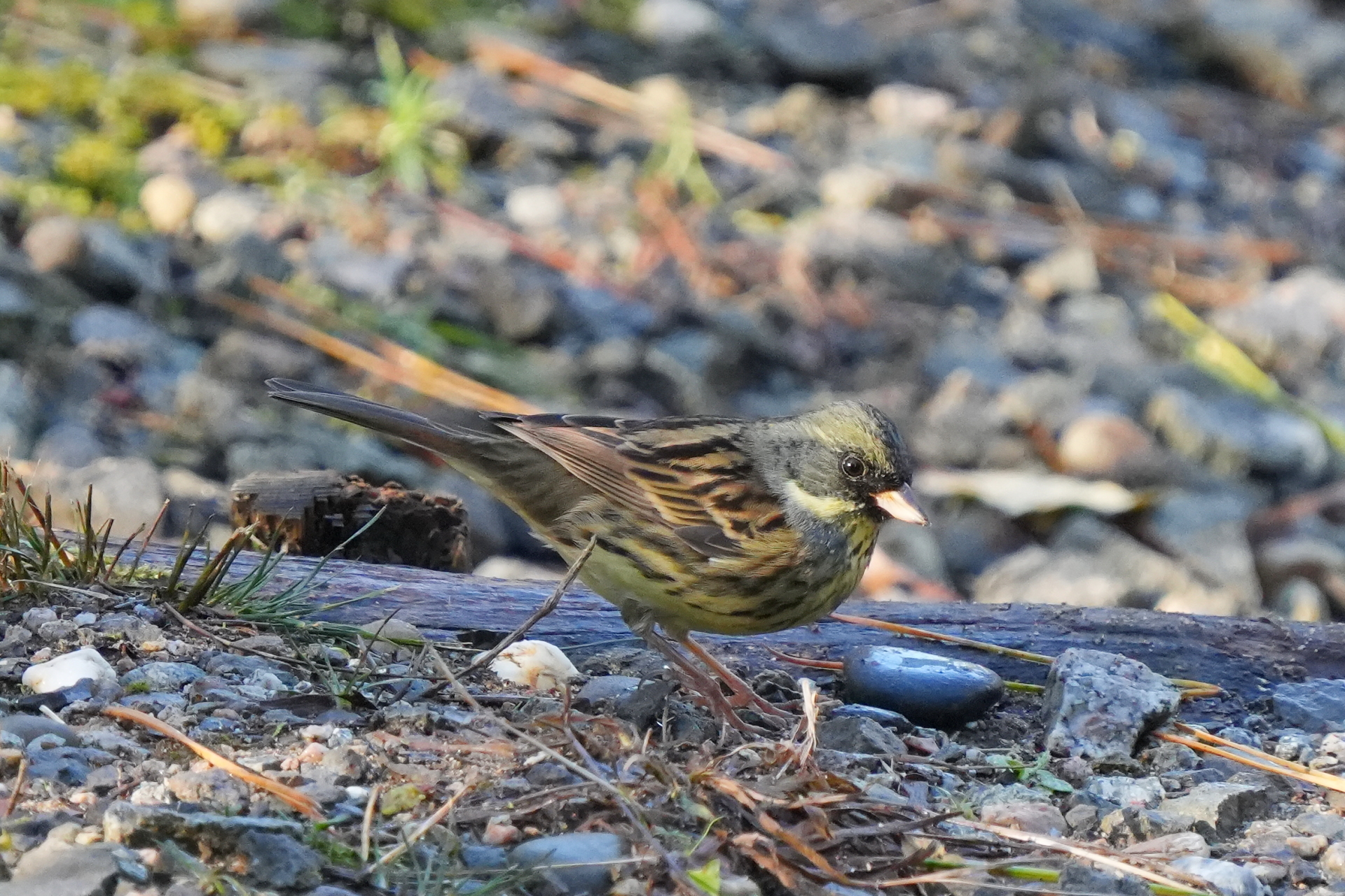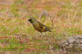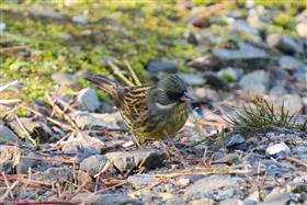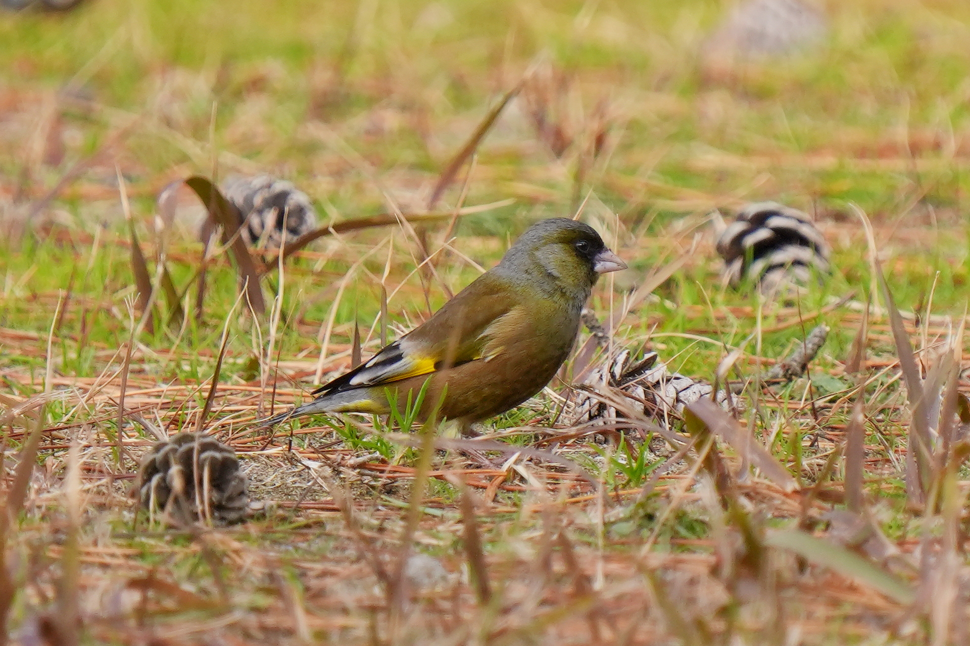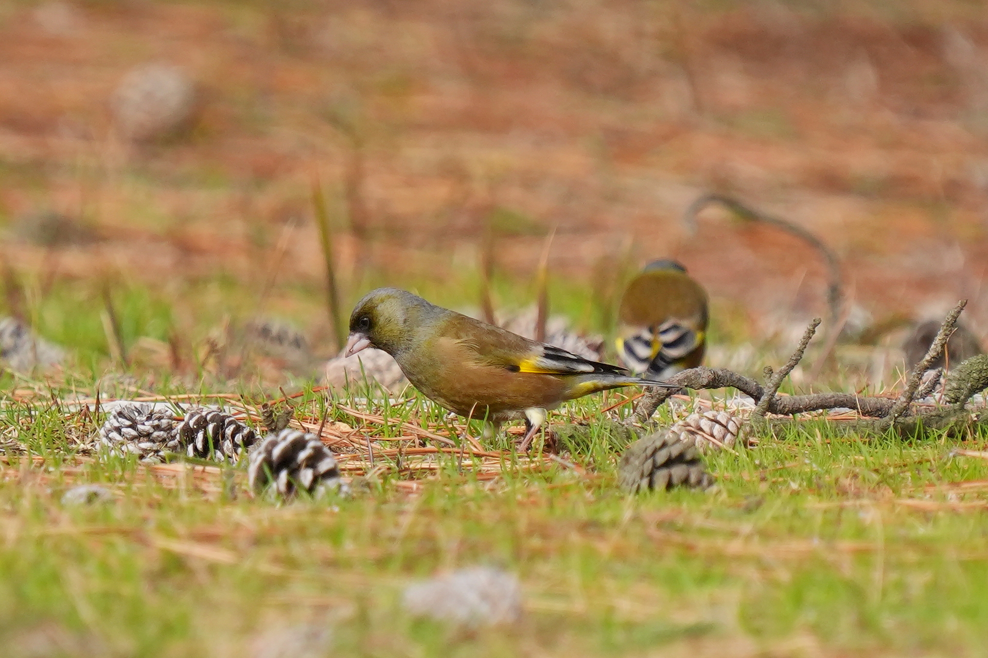 カワラヒワはどうやら下に落ちている松の実を食べているようだ